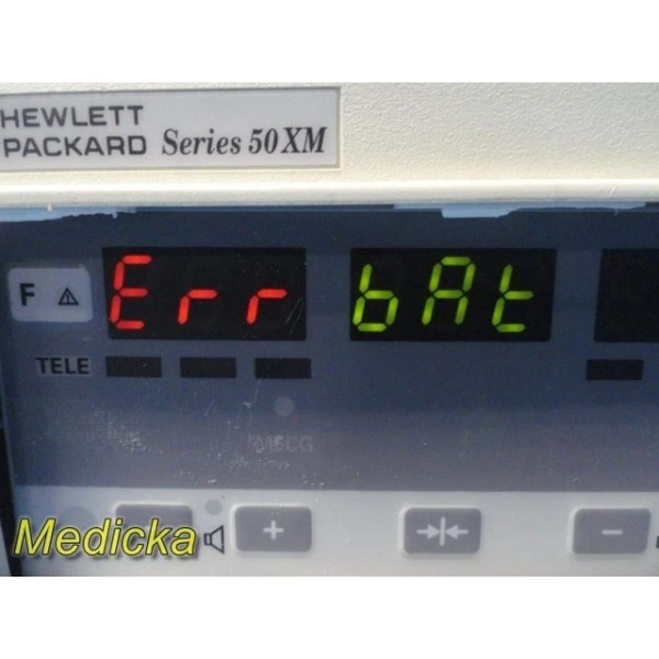 Pre-owned HP M1350B Fetal Monitor (Enhanced FE-BD), manufactured in Germany (1996), sold AS-IS for repair or parts only. Unit powers on and completes self-test but displays a battery error due to missing battery and holder. Integrated recorder advances paper, though printer and monitoring functions have not been fully tested. The monitor has significant cosmetic damage to the housing and bezel with visible wear. Requires repair, battery system replacement, and full preventive maintenance prior to any clinical use. Console and power cord only; no accessories included.