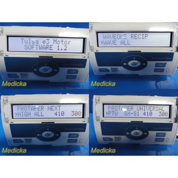 Dentsply Tulsa Dental Specialties E3 Torque Control Motor — software version 1.2. The unit powers on and loads multiple preset endodontic file programs including WaveOne, ProTaper Next, Vortex, Lexicon Gates, GT Series, and Profile GT. The system is responsive to control inputs and menus, making it suitable for refurbishment, parts, or use by repair specialists.