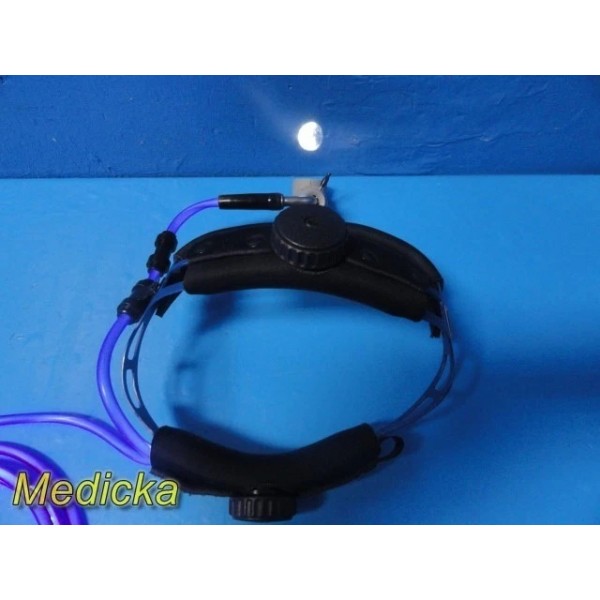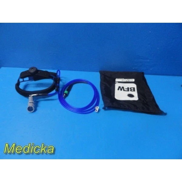 BFW surgical headlight system including adjustable headband, fiber optic light guide cable (~10 ft), and OEM storage pouch. Compatible with standard ACMI/CMI-style light sources. Tested and functional.