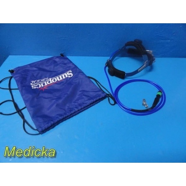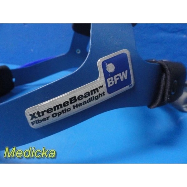 BFW XtremeBeam fiber optic surgical headlight set in great cosmetic and working condition. Includes fiber optic headlight, ~7 ft blue non-transparent light guide, and Sunoptics Surgical storage pouch. Tested with compatible illuminator and light output confirmed.