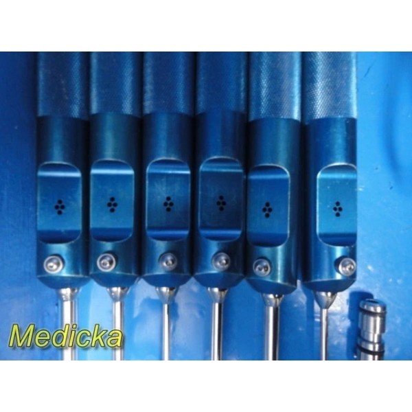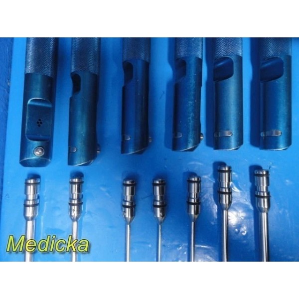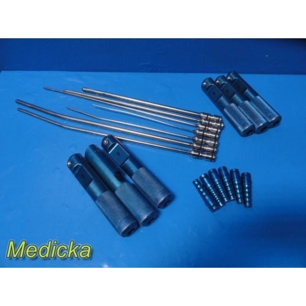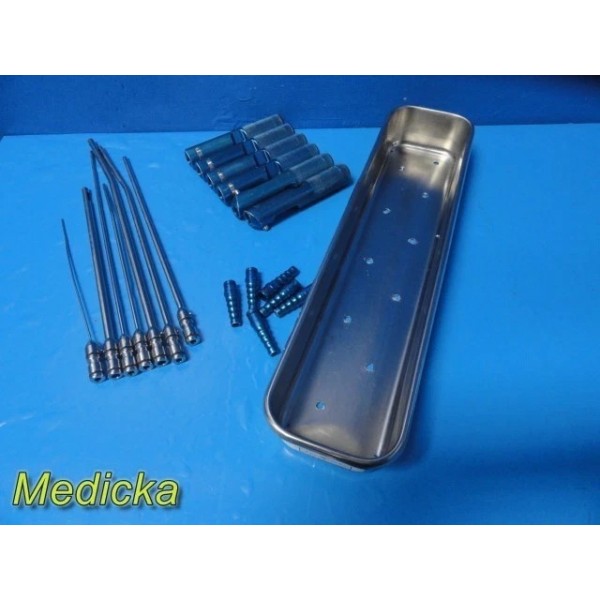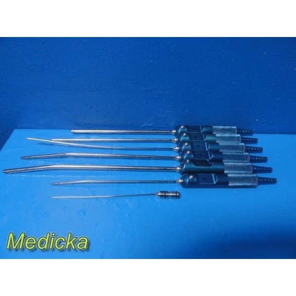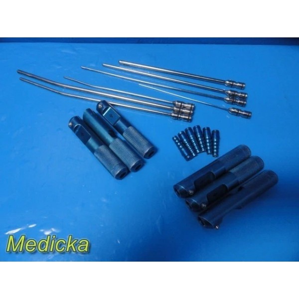 Item: | Lot of 7 Byron / Mentor-Compatible Liposuction Cannulas – Pyramid / Tapered Tip, Single Port, Straight & Swan-Neck Styles with 6 Knurled Handles, 6 Barbed Adapters & Vollrath 17" Stainless Tray |