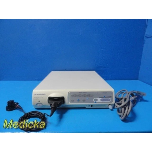 Olympus VISERA Pro digital endoscopy camera system with urology camera head. This system was tested using Y/C (S-Video) output and produced a clean live image with proper white balance. The camera head, coupler, and console are all in good working condition with normal cosmetic wear from prior clinical use.