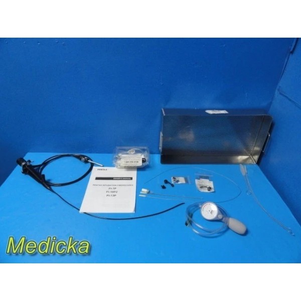 PENTAX FI-10P2 intubation fiberscope in excellent cosmetic and mechanical condition. Scope includes multiple accessories, cleaning brushes, Medivators processing kits (with manuals), and a surgical instrument storage / sterilization container with a sieved bas.