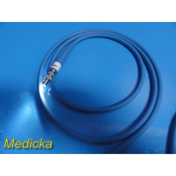 Blue fiber optic cable per manufacturer specification: Pilling® illuminator end, 3.5 mm bundle, 8 ft length, rotating instrument end. Outer jacket intact with no cuts or tears. Warning printed on cable: “Do not use for transillumination of skin — burn will result.” Cable transmits light properly.