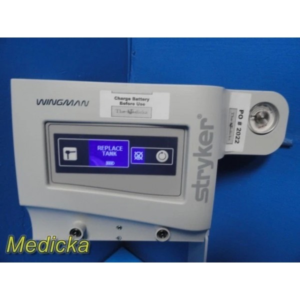 Stryker Wingman Scope Holder Control Unit used with compatible Stryker scope holding systems. Both units power on properly and initialize with bright LCD displays. During testing the screen displays “Replace Tank” since no tank assembly was connected. Each unit includes the integrated pressure regulator with gauge, rear pole clamp, carry handle, internal battery pack, and power cord.