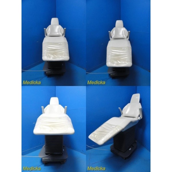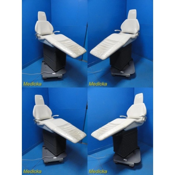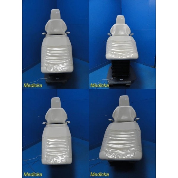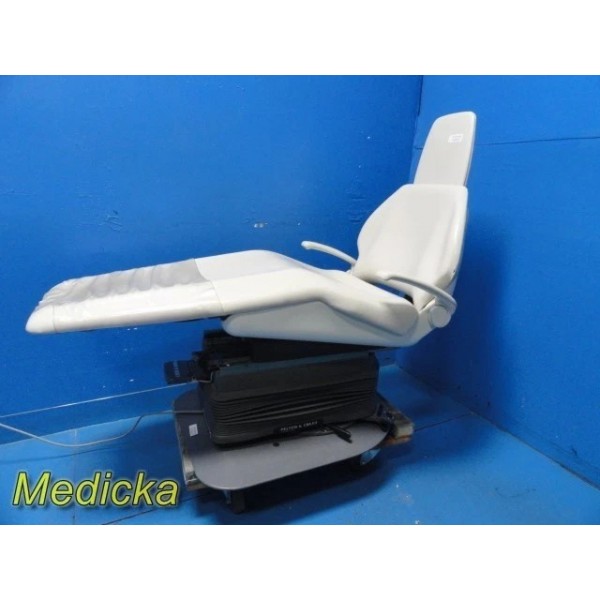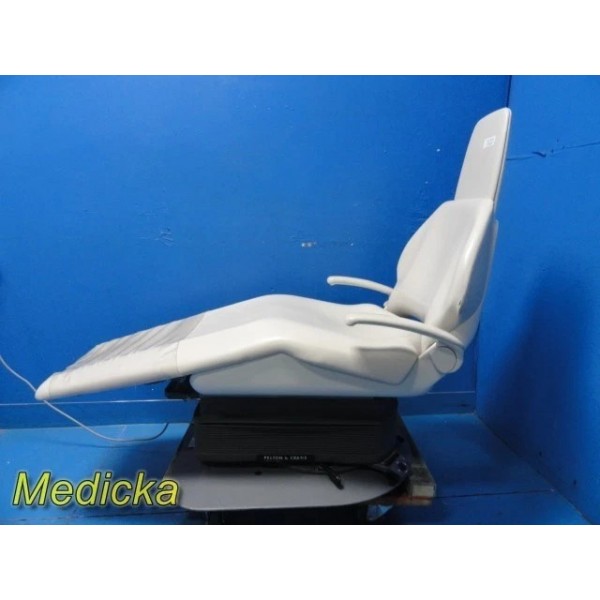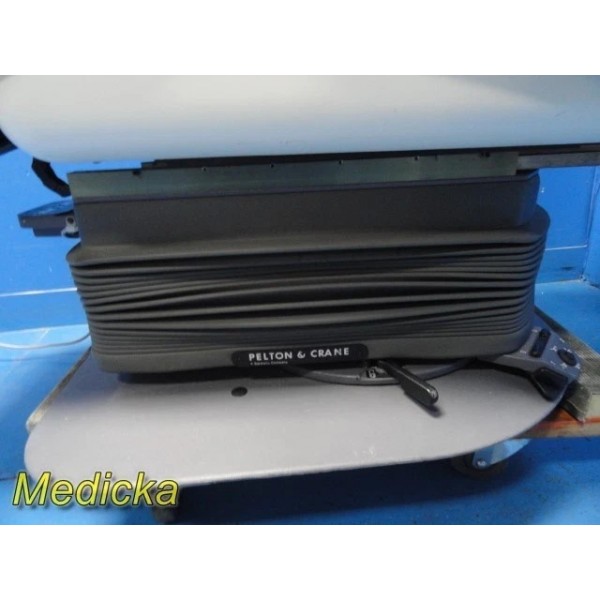 Pelton & Crane powered procedure/exam chair with adjustable height, horizontal slide, and rotation functions. Equipped with dual foot controls for movement on either side and a central lever for fore–aft adjustment. The chair is designed for ergonomic operation in dental or examination environments.