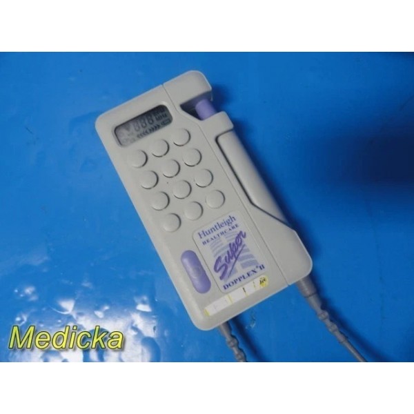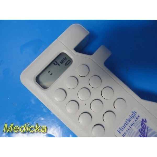 This listing is for a Huntleigh Super Dopplex II (SD2) handheld vascular/obstetric Doppler with a 4 MHz VP4HS detachable probe. The system includes an integrated coiled interface cable and a clear digital display for BPM readouts. Designed for vascular and fetal heart signal detection, this Doppler runs on a standard 9V battery (not included).