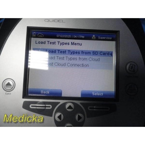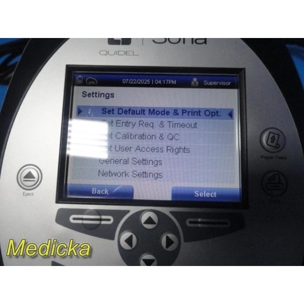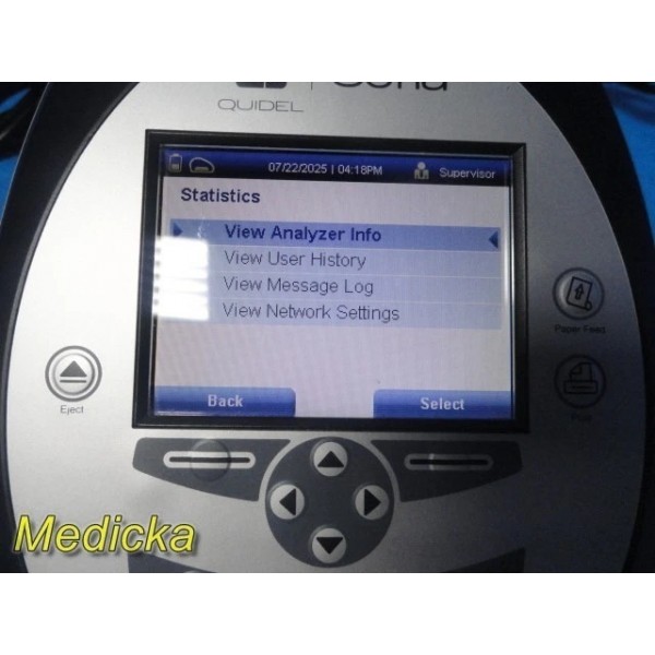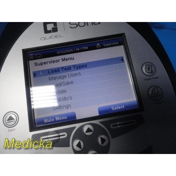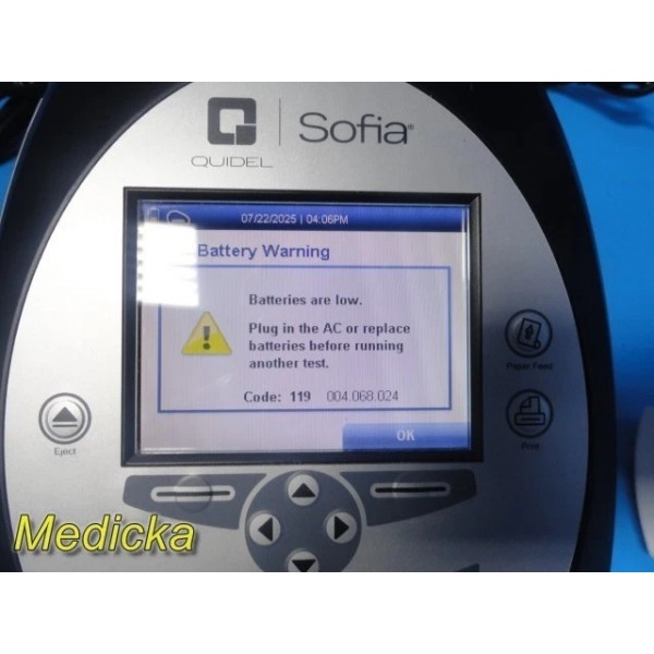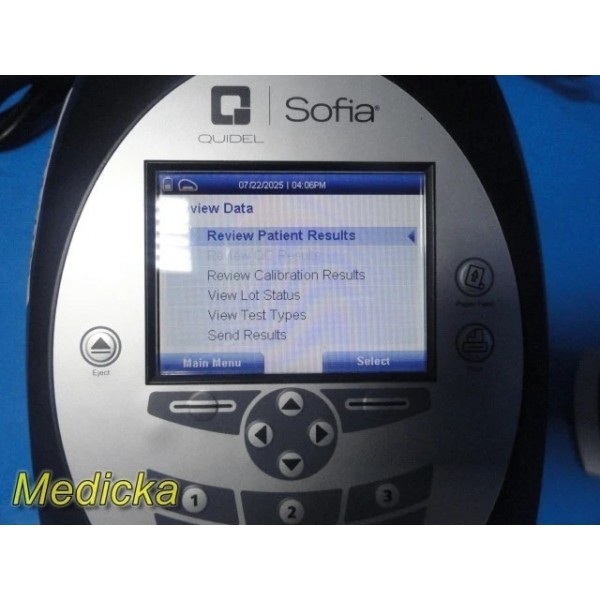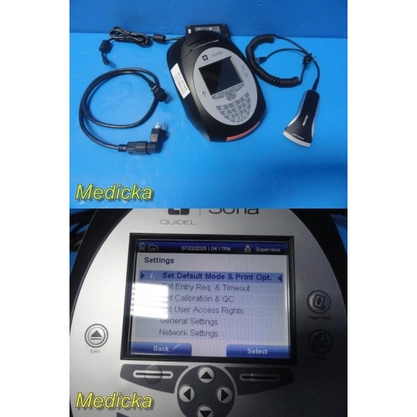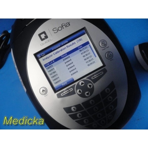 Pre-owned Quidel Sofia Analyzer with barcode scanner & AC adapter.Software Version: 02.50.00. Powers on, passes self-test, LCD & printer functional. Supports multiple test types. Batteries, SD card, and test cassettes not included. Powered via 4× LR6-AA batteries or AC power supply. Charge battery before use. CE marked device.