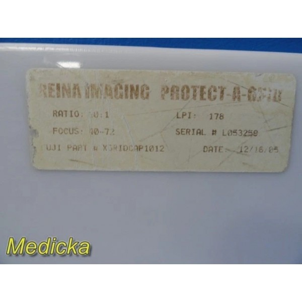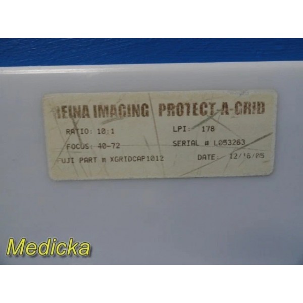 This listing is for a lot of two Reina Imaging Protect-A-Grid cassettes, model XGRIDCAP1012. These grid protectors are designed to shield delicate grids during portable radiography and are compatible with FUJI systems. Both units are labeled with detailed specifications including a 10:1 ratio and 178 LPI, designed for a focal range of 40 to 72 inches.