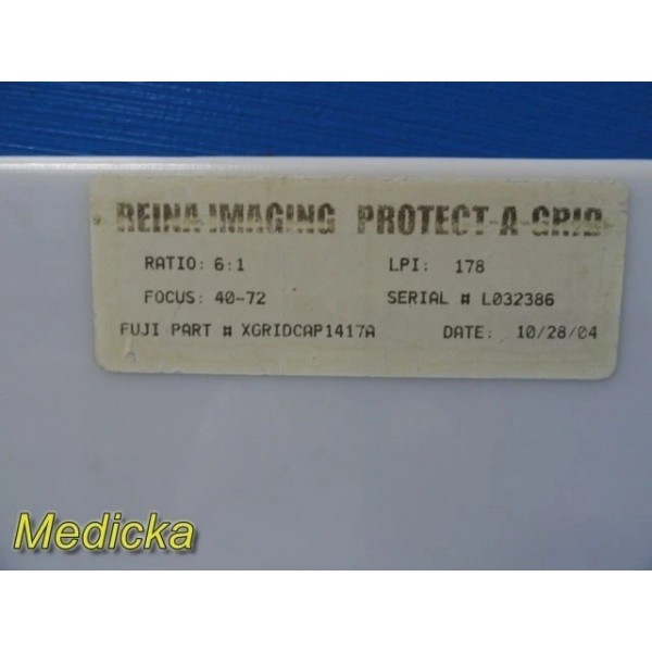 This listing is for a Reina Imaging Protect-A-Grid (FUJI Part # XGRIDCAP1417A), designed for use with radiographic imaging systems. It offers a 6:1 grid ratio, 178 LPI resolution, and a 40–72 cm focal range. The protective frame is designed for long-term durability and compatibility with FUJI systems.