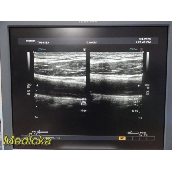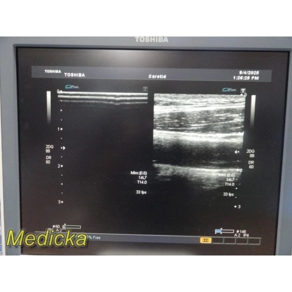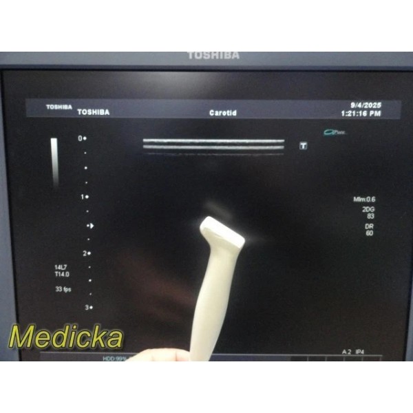 Toshiba PLT-1202S is a 12 MHz linear array transducer designed for vascular, small parts, musculoskeletal, and superficial imaging applications. It is compatible with Toshiba ultrasound consoles and recognized by the system during testing.