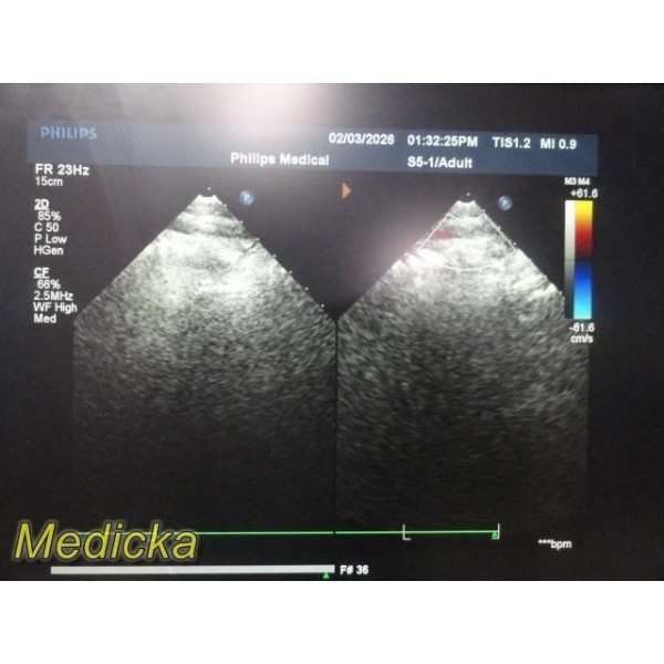 This probe was tested on a Philips iE33 system (not included) with air scan, right carotid vascular imaging, and RUQ hepatorenal body scan. A cable tear near the probe body is present and has been taped—please review images carefully. Phantom scan results could not be fully evaluated, and echocardiography was not performed. This probe has not been designated for detailed clinical exams. Buyer is responsible for confirming compatibility and completing full clinical testing prior to patient use.