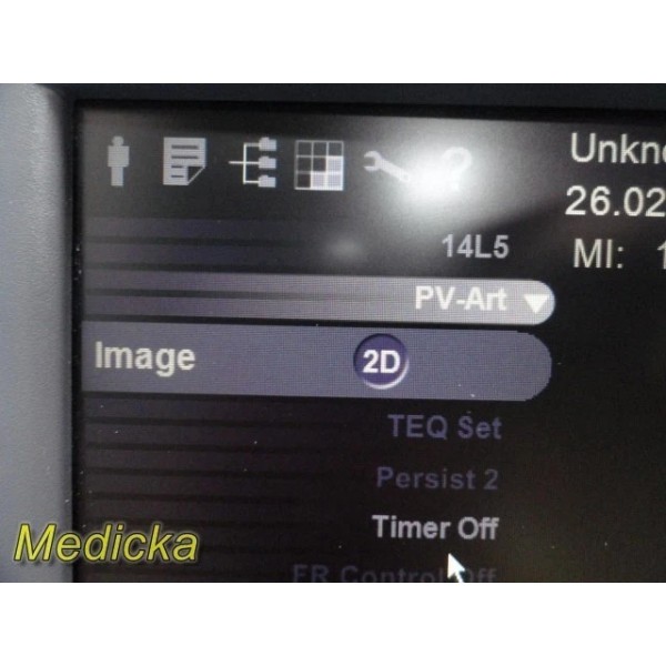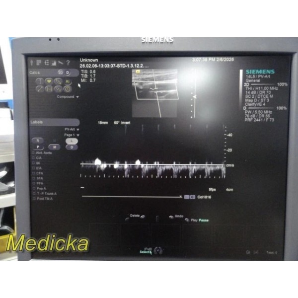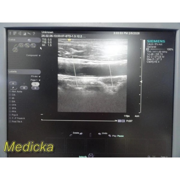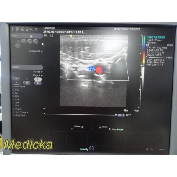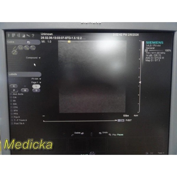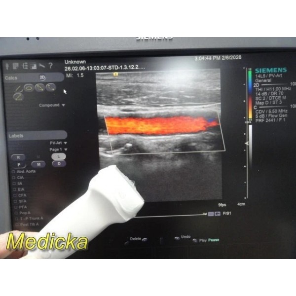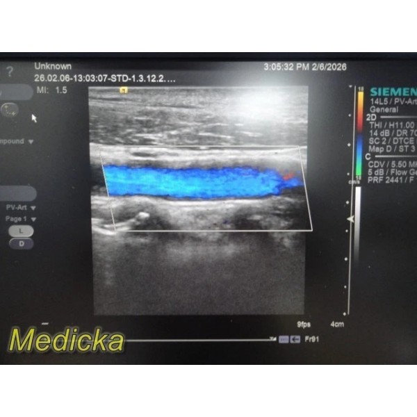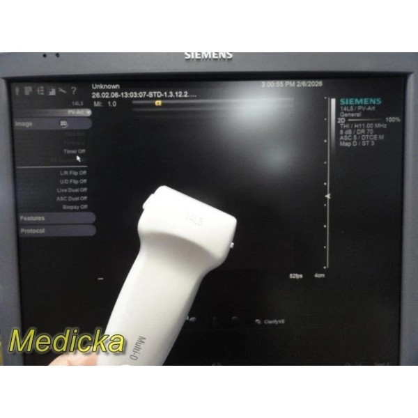The Siemens ACUSON 14L5 is a high-frequency linear array ultrasound transducer designed for vascular, small parts, and superficial imaging applications. This unit was tested on a Siemens S2000 system and demonstrated functional 2D and Color Doppler performance during basic evaluation.
