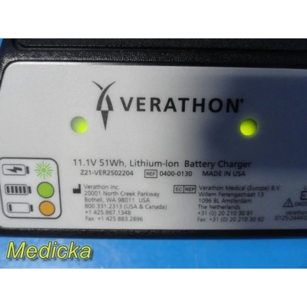 Verathon lithium-ion battery charging system offered with two battery packs and compatible Adapter Tech AC adapter. Unit powers on and both batteries indicate full charge.