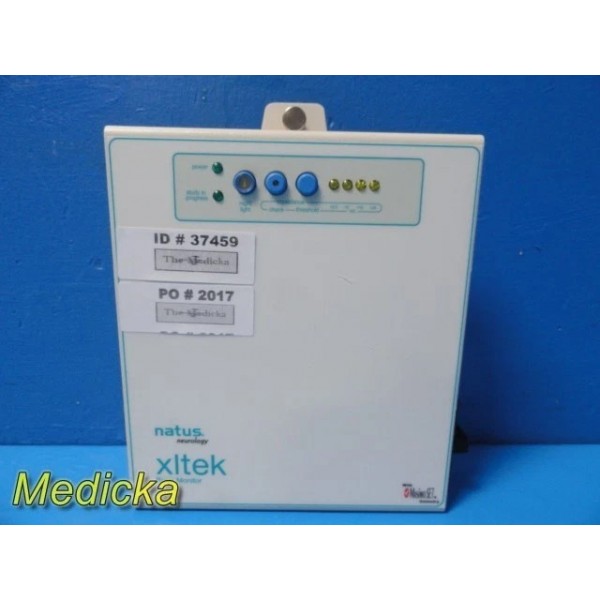 This listing is for a Natus Neurology Xltek Brain Monitor, designed for neurodiagnostic and EEG applications. The unit includes a rear mounting bracket, hospital-grade power cord, and various I/O ports. It powers on with active LED indicators but is sold as-is due to missing essential accessories required for full testing.
