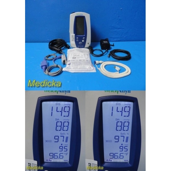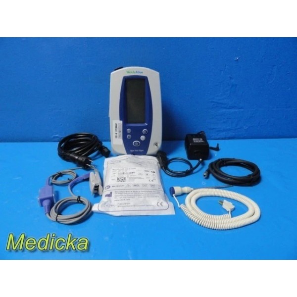 Pre-owned Welch Allyn 42NTB Spot Vital Signs Monitor with battery and leads. Supports Temperature, SpO₂ (Nellcor), and Non-Invasive Blood Pressure (NiBP) measurements. Includes NBP hose, new adult cuff, used SpO₂ sensor, used temperature probe, power adapter, and power cord. LCD is bright and scratch-free; unit shows minor signs of wear, no errors detected. Printer, stand, and additional leads not included.