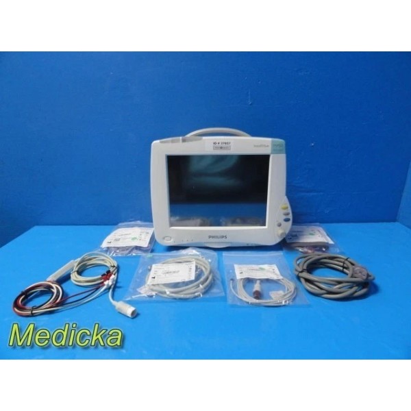Pre-owned Philips Intellivue MP50 (M8004A) Patient Monitor with Temp, Press, and extension - MMS Modules, and leads. Fully tested and functional, supports ECG, SpO₂ (Nellcor), NBP, Temperature, and IBP. Includes listed accessories, with moderate cosmetic wear and signs of previous use.