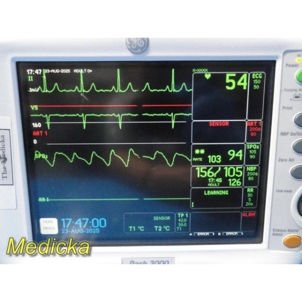 GE Dash 3000 Patient Monitor 1X SH3947D NBP Hose W/ Cuff, Adult Ref SC1721-17 (Both New) 1X SG5112S ECG Cable W/ 5-Leads, SNAP AHA (New) 1X SP9310W Resusable SpO2 Sensor (New) 1X ST1304 Reusable Temperature Probe (New) 1X SB0407 IBP Adapter Cable (New) Power Cord *Items shown in photos are the items that will ship. If it is not shown in the photos, it is not included*