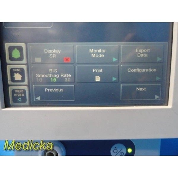 Covidien BIS Aspect Complete Monitoring System with clear LCD interface, multiple configuration settings, and front-facing EEG port. This unit is designed for monitoring the depth of anesthesia via BIS index. The system includes integrated software to configure EEG channels, alarm parameters, smoothing rate, and export functionalities.