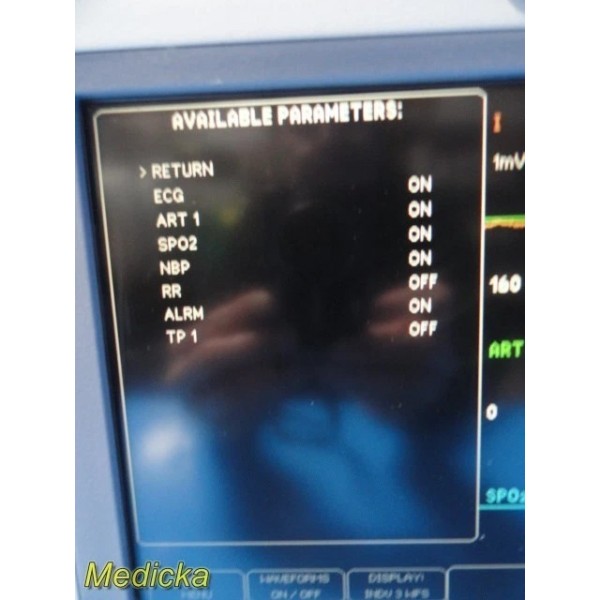 - ECG – ON ART1 – ON SpO₂ – ON NIBP – ON RR – ON TP1 – ON ALRM – OFF