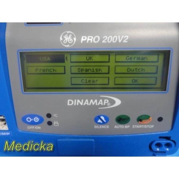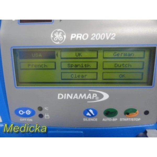 GE PRO 200 V2 Patient Monitor with installed NIBP, MAP and Temperature capability. Unit powers on, passes self-test, displays startup screens, and reaches country selection window. Offered strictly AS-IS for repair due to navigation/trim knob failure preventing full system access or parameter testing.