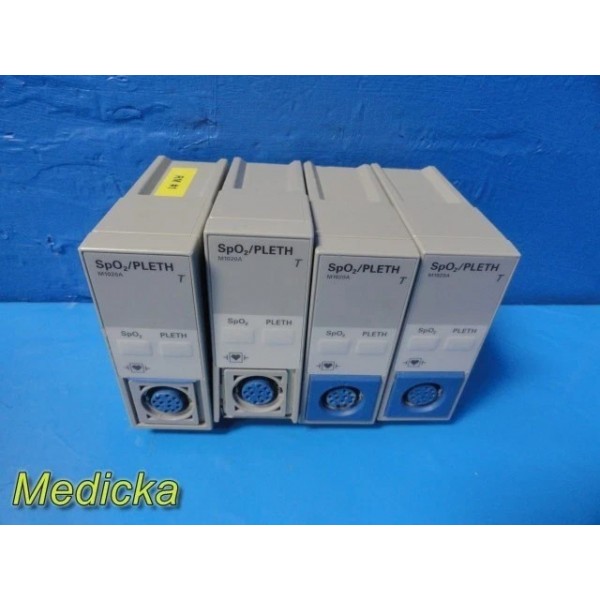 Lot of four (4) HP / Philips / Agilent M1020A SpO₂ / Pleth modules removed from a working environment. All modules have been tested and found functional; cosmetic defects are present. Offered AS-IS.