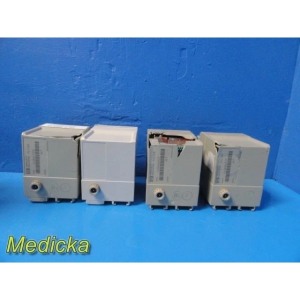 Lot of four (4) Hewlett Packard / Philips M1116B medical recorder/printer modules. All units show significant cosmetic and structural damage. Some units are missing doors, some have cracked housings, and all are missing bottom release latch clips. These units have not been powered or function-tested.