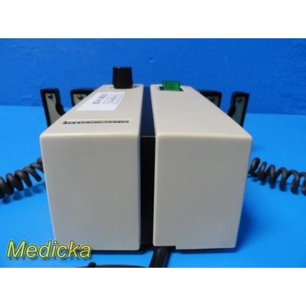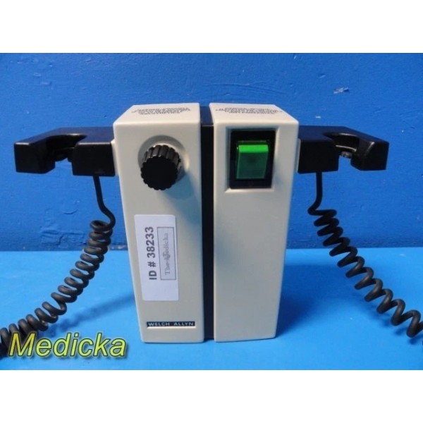 Welch Allyn Model 74710 Transformer is a durable, dual-handle diagnostic power supply system designed for powering compatible otoscope and ophthalmoscope heads. This unit provides stable 3.5V output for consistent illumination, features a responsive intensity control knob, and includes two coiled power handles for clinical use. Ideal for ENT and general examination environments.