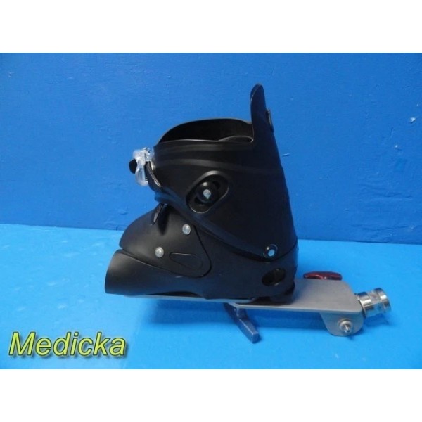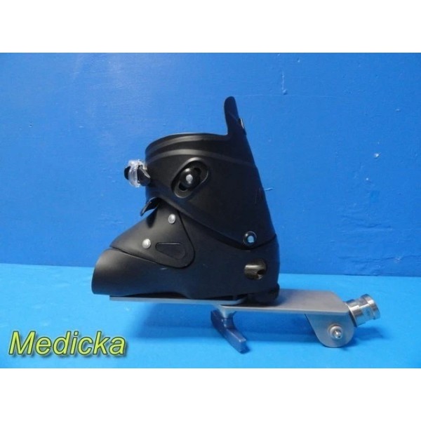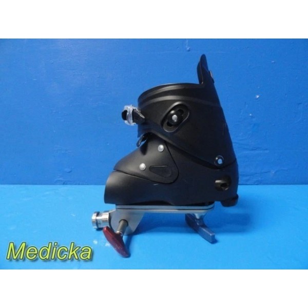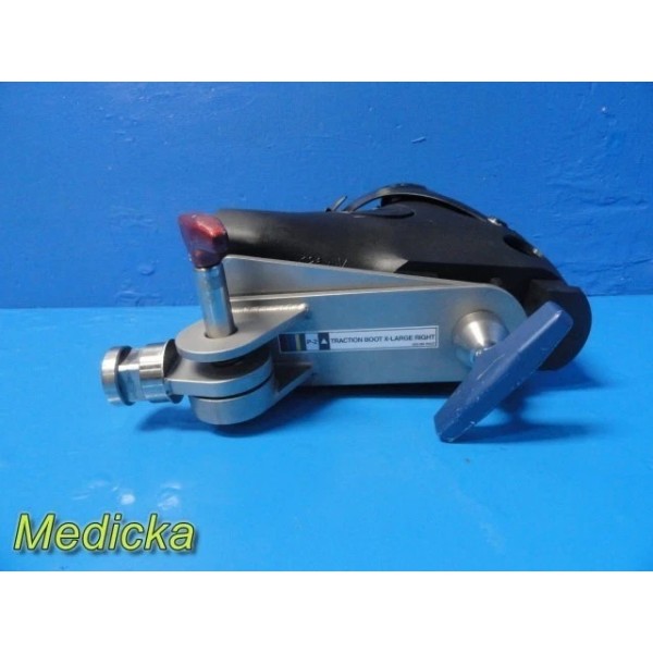 This listing is for a Mizuho OSI Traction Boot X-Large Right with Plate. It is designed for use with orthopedic traction tables and comes securely attached to its boot plate, which interfaces with the table plate for stable positioning. The boot includes intact red and blue clamping knobs for secure adjustment.