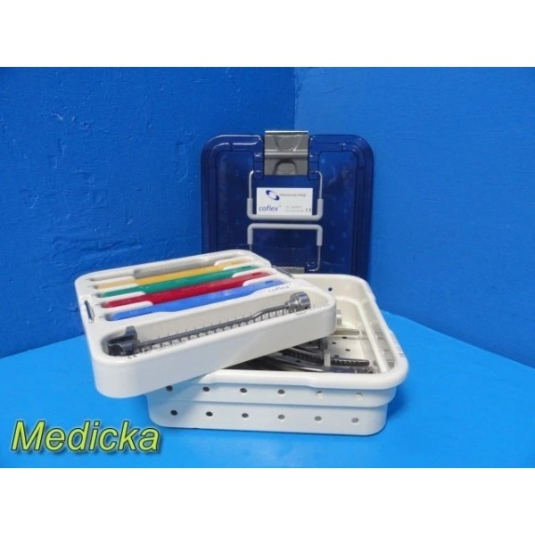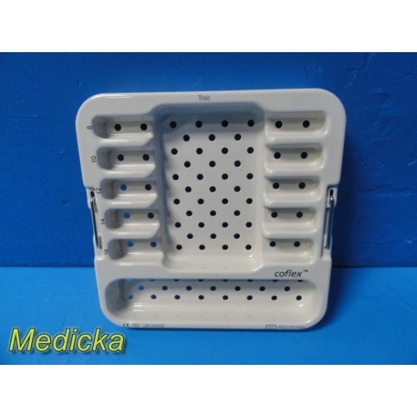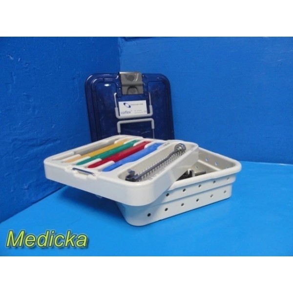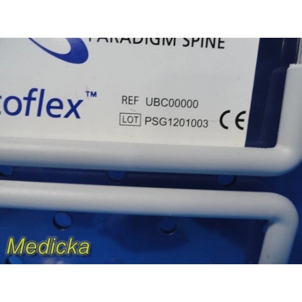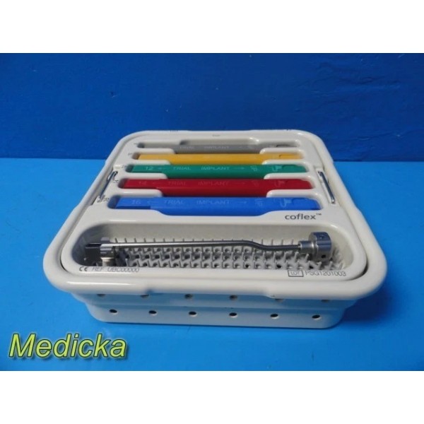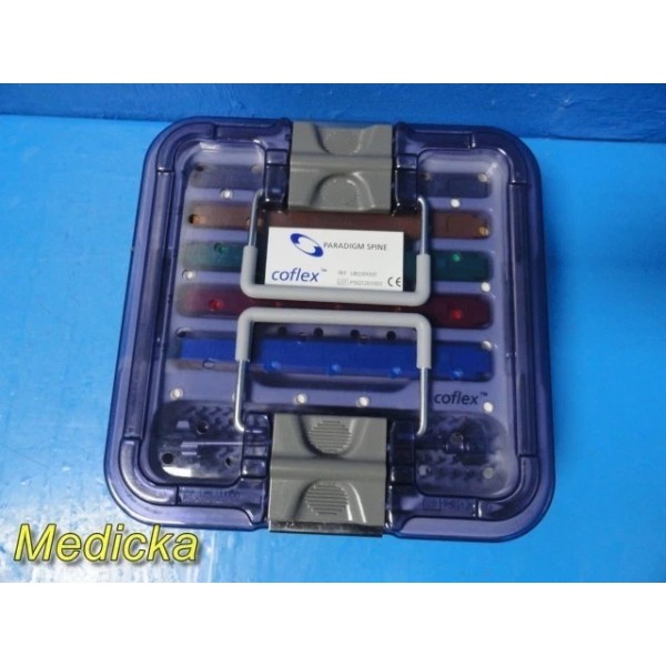 Complete Coflex® Paradigm Spine surgical set including CE-marked instrumentation and trial implants. All components are in excellent cosmetic and functional condition, housed in a dual-tray sterilization system. Designed for precision spinal implant procedures.