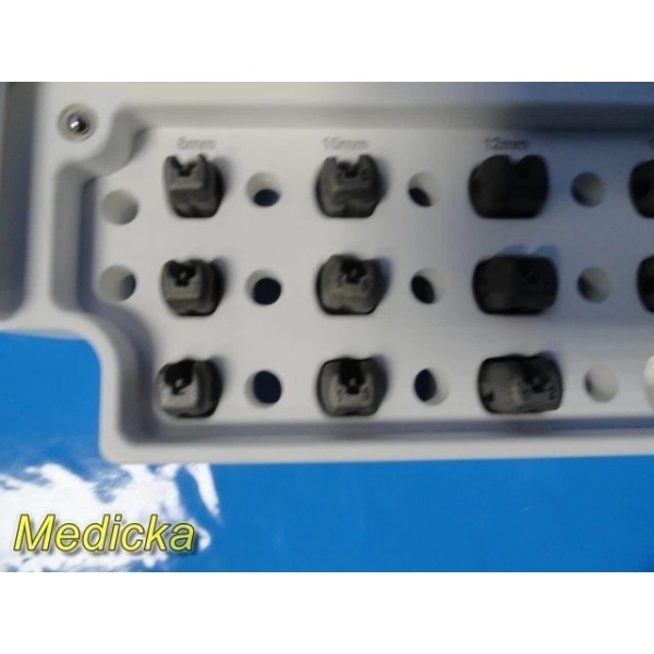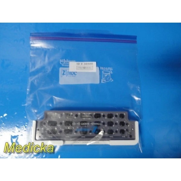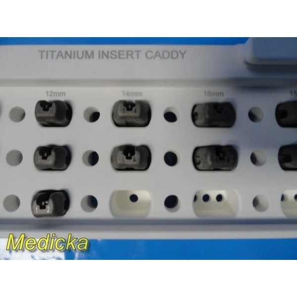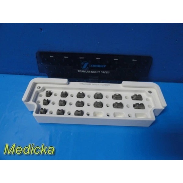 This listing is for a genuine Zimmer Titanium Insert Caddy, used to organize and store Zimmer Biomet titanium knee system inserts. This listing includes only the tray and adapters — no implant inserts are included.