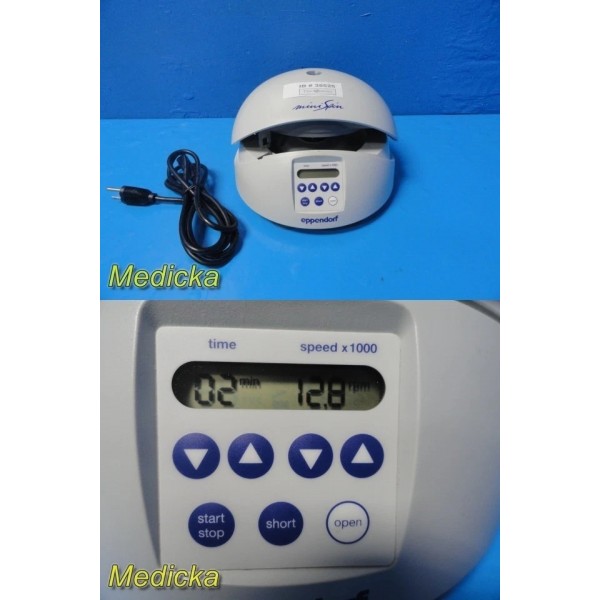 This listing is for an Eppendorf MiniSpin centrifuge, a compact benchtop centrifuge designed for quick spins and routine laboratory applications. It features a digital control panel with time and speed adjustments and a bright LCD display. Listed for PARTS/REPAIR.
