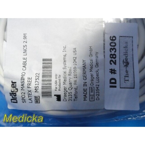 OEM Draeger Medical MS17522 SpO2 Masimo Cable, LNCS 2.9M, Reusable ~ 28306