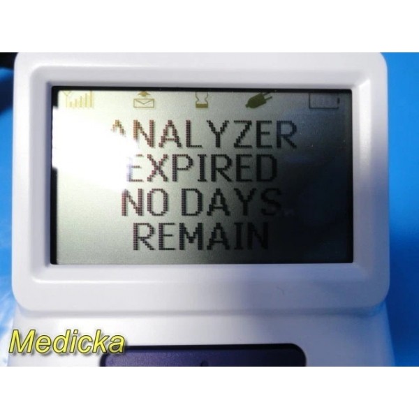 - Analyzer: Open box, never used clinically. Powers on, passes self-test, screen displays a message indicating “No more days left” — consistent with device software lock due to expiration status.