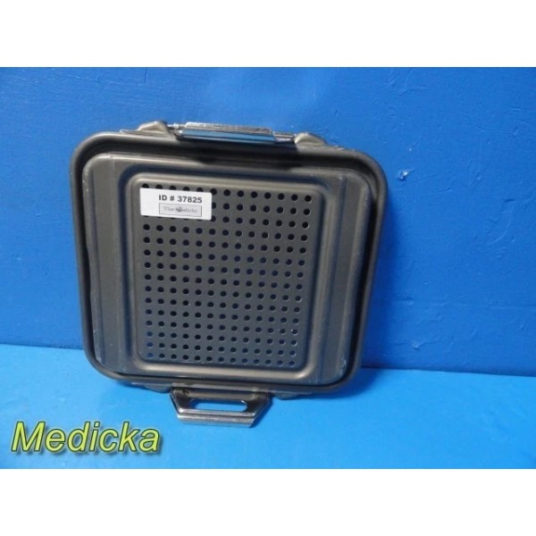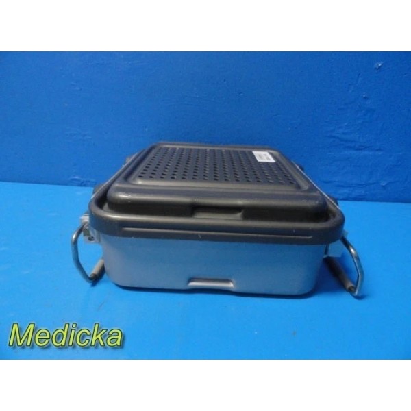 This is a pre-owned V. Mueller / Genesis / Allegiance Half-Length Sterilization Container in fair cosmetic condition. Lock clamps, handles, and rubber/silicon seals are intact, and the lid fits securely. Shows minor scuffs and scratches from prior use. Retention plates, instrument basket, silicone mesh and manual are not included.