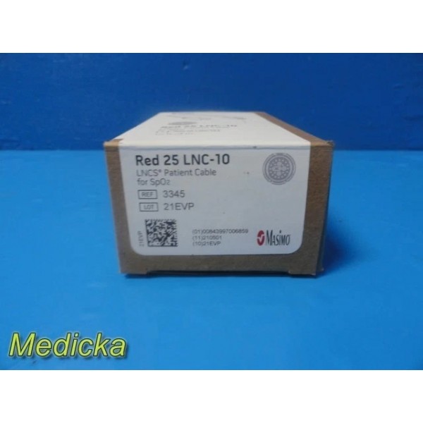 Masimo Red 25 LNC-10 LNCS Patient Cable, Ref 3345, Lot 21EVP. A 10 ft (3 m) OEM patient cable for SpO₂ monitoring, designed for use with LNCS sensors and compatible Masimo-equipped monitoring systems.