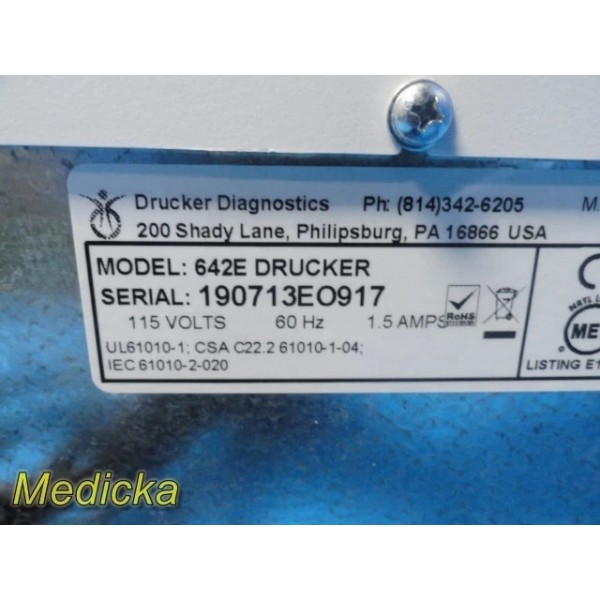 - Drucker Diagnostics Model 642E centrifuge (S/N: 190713E0917)