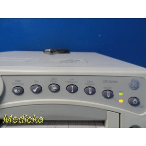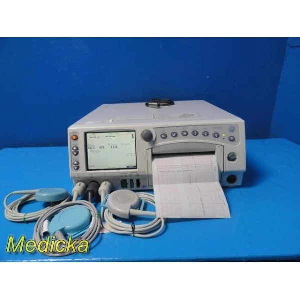 Reliable and fully functional GE Model 259A Maternal Monitor with tested Ultrasound, TOCO, and NBP capabilities. Includes essential probes, clicker, and accessories. Printer and display are operational; cosmetic wear present from prior use. Ideal for clinical monitoring with key features intact.
