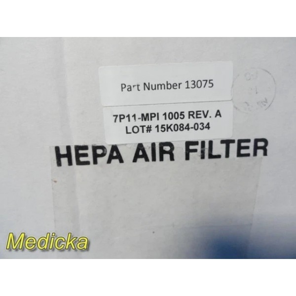 Lot of two HEPA Air Filters (PN 13075, Model 7P11(MPI)1005 REV. A). Both filters are unused and remain secured inside original packaging, suitable as replacements or spares for compatible air filtration systems.