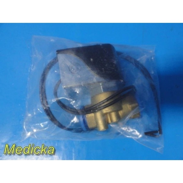 Parker Hannifin 06F20C2214BCFGC05J solenoid shutoff valve for air, water, and light-oil use. Features a brass valve assembly, dual-voltage AC coil, and multiple regulatory certifications. Item is new open box and unused.