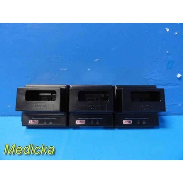 Professional LIND Electronics CF-LND3BAYC2 (CF-C2) triple-bay charger designed for Panasonic Toughbook batteries. Each charger is bundled with a brand-new, non-OEM compatible AC adapter. Units were individually powered on—each bay shows a green indicator light. Chargers are new open-box with minor cosmetic shelf wear.