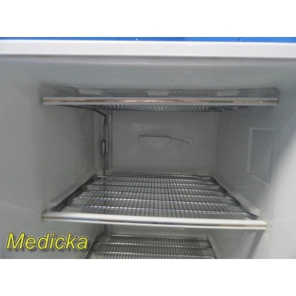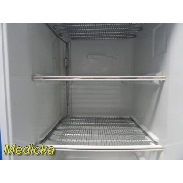 Compact, free-standing upright freezer suitable for household, office, light facility, or laboratory storage applications. Includes integrated power cord and adjustable internal wire shelving. Unit cools properly and is in good working condition despite cosmetic wear.