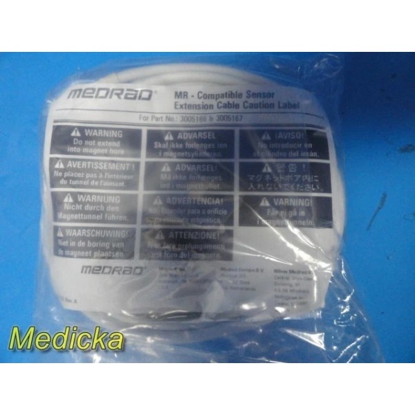 Medrad 3005166 is an MR-compatible sensor extension cable (15 ft) with LEMO medical-grade connectors. Cable appears new/unused and includes the original Medrad caution label.