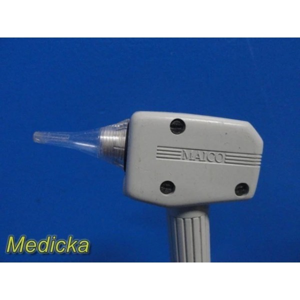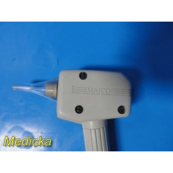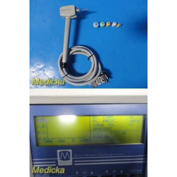 MAICO MA 640 tympanometer probe with assorted ear tips. This probe was tested on a MAICO MA 640 tympanometer / audiometer system and produced proper responses with all indicator lights active. The probe, cable, and hose are in good working condition.