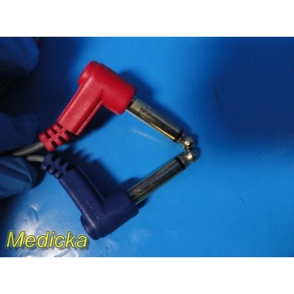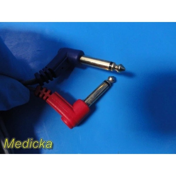 MAICO audiometer headphone set with headband and MX-41/A R red and blue audio cups. This set includes the complete headband assembly and interface cable with dual 1/4" audio plugs. The headphones were tested on a MAICO MA 640 tympanometer/audiometer system and produced proper audio output from both channels.