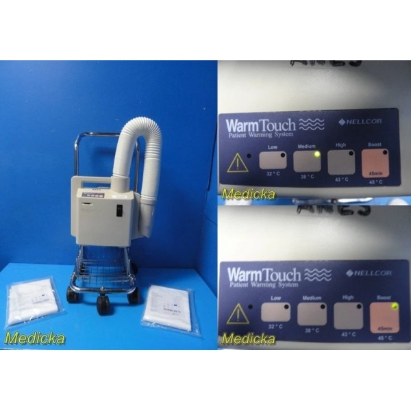 Covidien / Nellcor WarmTouch™ forced-air patient warming system supplied with a rolling transport cart, expandable/retractable warming hose, and one complete set of new, unused disposable blankets (upper and lower body). The warming unit has been tested and is fully functional, showing normal cosmetic wear consistent with clinical use.