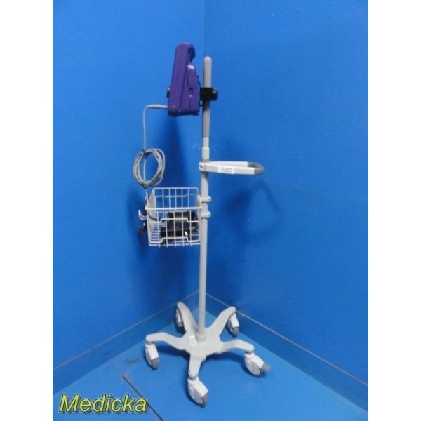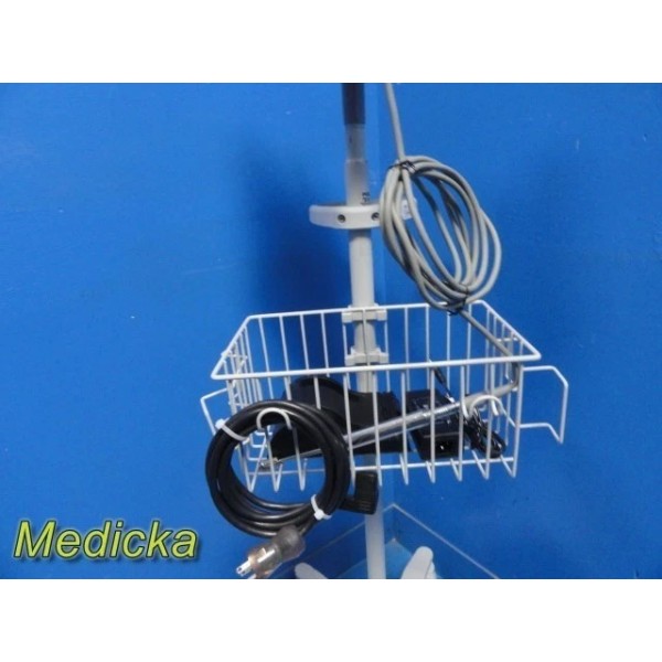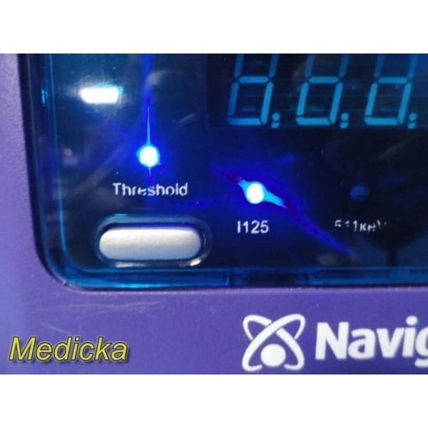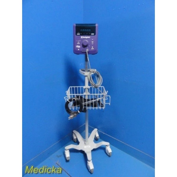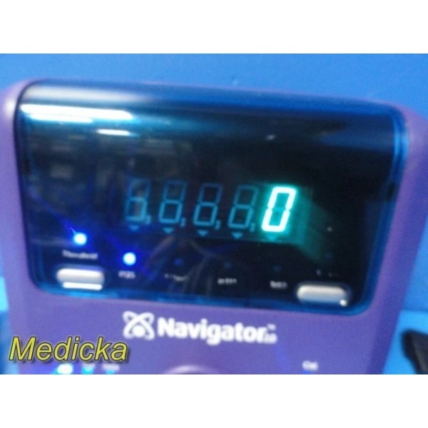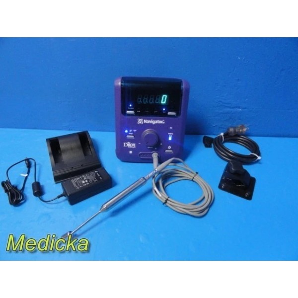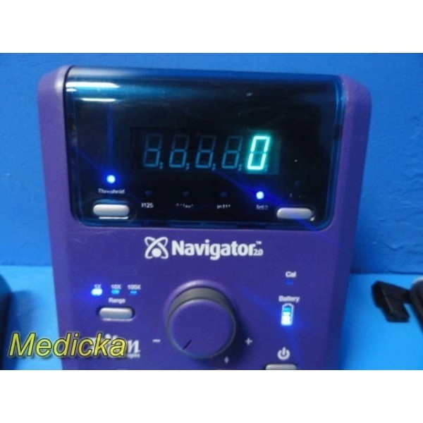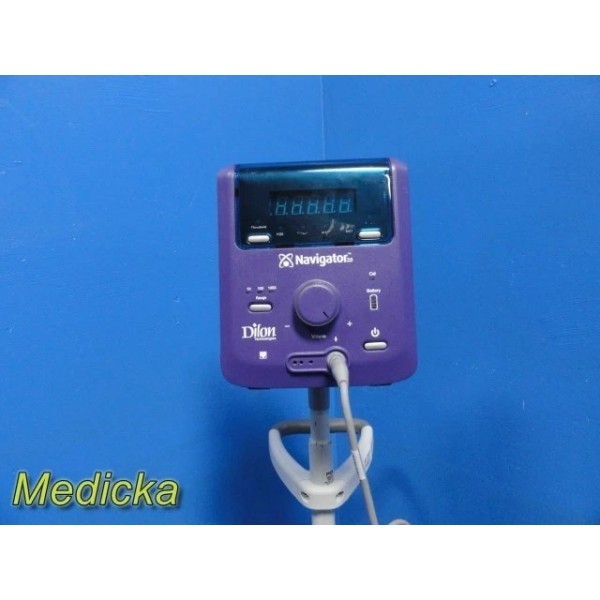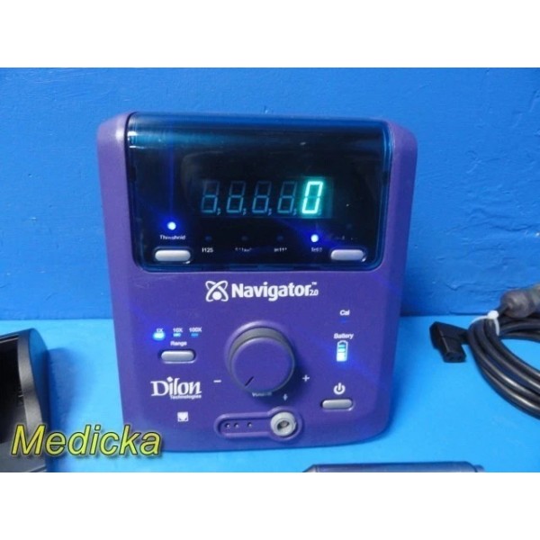 The Dilon Navigator 2.0 is a compact gamma detection system designed for lymphatic mapping and intraoperative localization procedures. This listing includes the Navigator console, angled gamma probe, interface cable, one rechargeable battery, charger dock (non-functional, see notes), AC adapter, mounting clamp, and a PolyMax / GCX rolling stand. The system powers on, passes self-test, and responds properly to user inputs.