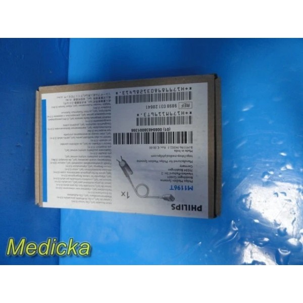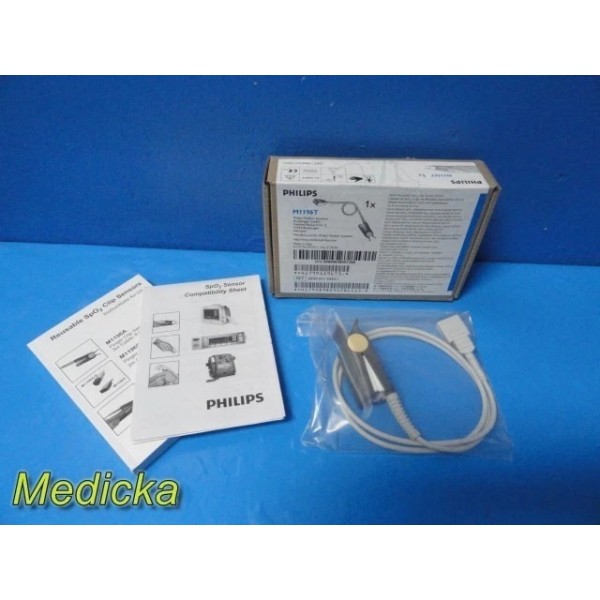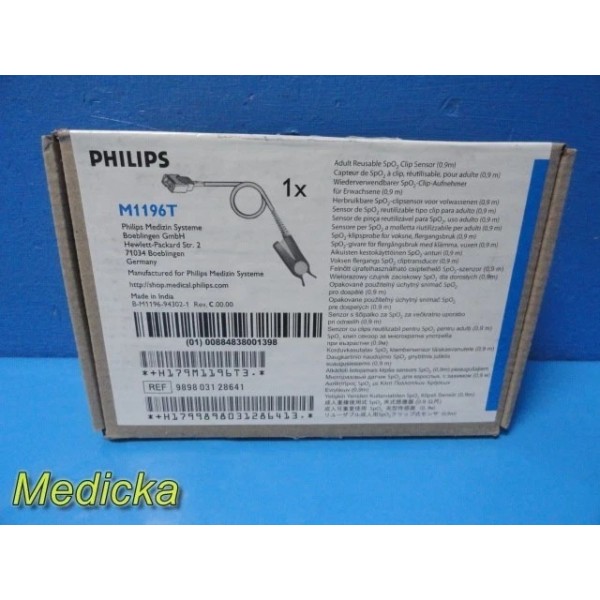 Philips M1196T adult reusable SpO₂ finger clip sensor with 0.9 m cable and 9-pin connector. Brand new OEM units supplied in original Philips packaging with instructions for use and compatibility sheet.