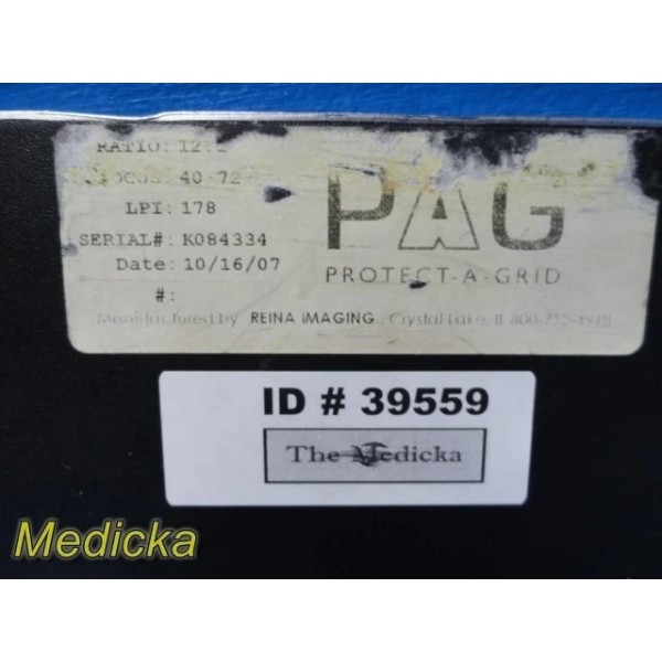 Reina Imaging PAG Protect-A-Grid radiographic grid featuring 12:1 ratio, 178 LPI, and 40–72” focal range. Larger format grid with approximate overall size of 18.25” x 15.25”. Structurally intact but shows visible edge wear and minor corner deformation.