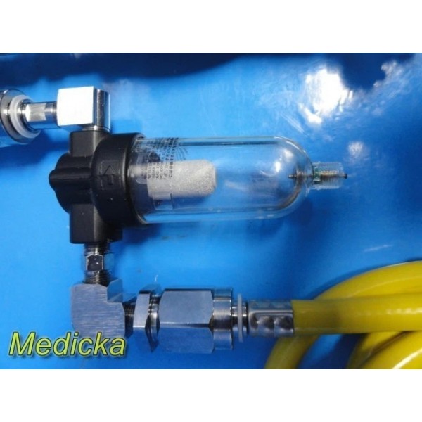 BIO-MED Devices High/Low Flow Air-Oxygen Blender Ref 2001 with conductive air & oxygen hoses, auxiliary Porter outlet, oxygen Y-coupler (P/N 2153), and inline moisture dryer. Untested.